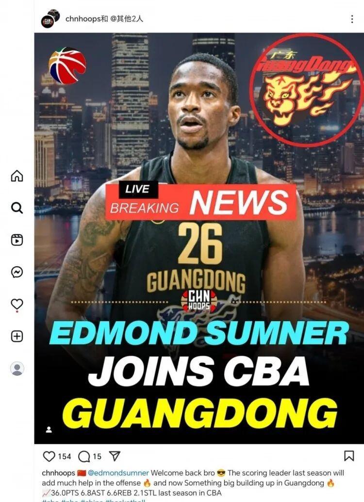 根据国外媒体人透露的最新消息,上赛季效力四川男篮的超级得分外援,将在新赛季加盟广东宏远,他就是艾德蒙-萨姆纳;萨姆纳上赛季代表四川男篮出战26场比赛,场均出战35.9分钟,可以得到36分6.6篮板6.8助攻2.1抢断,投篮命中率44.8% ,三分命中率31.5%,萨姆纳凭借着场均36分的出色表现当选上赛季CBA常规赛的得分王。